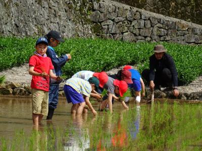 5/23午前中、大野原区宇坪地区の田んぼで、大野原小学校1〜6年生が田植えをしました。子供達は、おたじゃくしを捕まえて見せてくれたりしながら、張った紐の目印のところに思い思いの(?!)本数の苗を植え付けて無事に終了しました。秋には餅米となり学校で餅つきをするサイクルです。